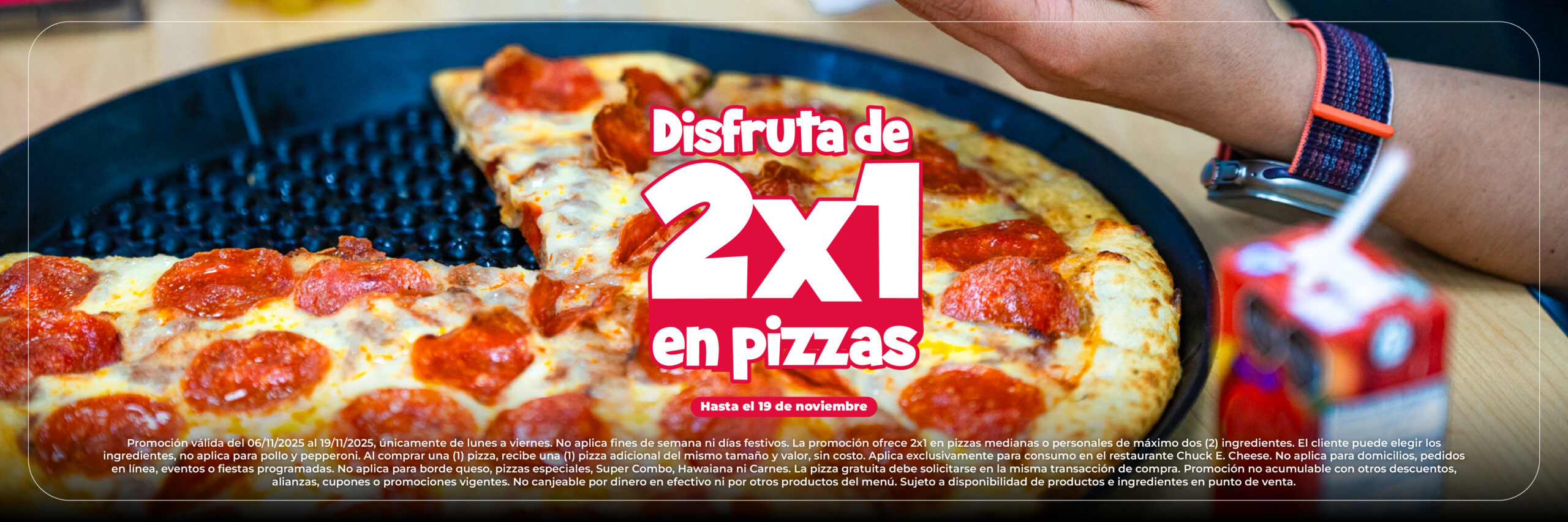 - 2 porciones de Pizza (1 ingrediente) por niño
